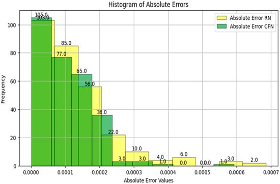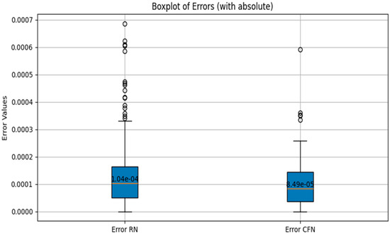 The descriptive statistical analysis of the absolute errors from the recurrent network and cascaded forward network, as presented in Figure 13, provides valuable insights into the performance of each model. For the recurrent network model, 291 measurements were analyzed, yielding an average absolute error of 1.27 × 10−4 and a standard deviation of 1.14 × 10−4, indicating considerable variability in these errors. The minimum absolute error recorded was 2.78 × 10−7, while the maximum reached 6.86 × 10−4, signifying instances of highly inaccurate predictions. Most errors were distributed between the first quartile (25% at 5.01 × 10−5) and the third quartile (75% at 1.64 × 10−4), suggesting that around 50% of the error values cluster around 1.04 × 10−4. This indicates that despite some extreme values, most errors are relatively small.