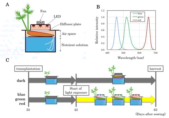 Overview of the study design. (A) Hydroponic system utilized in this study. (B) Light spectrums of blue, green, and red LEDs used in this study. (C) Detailed timeline of this study.