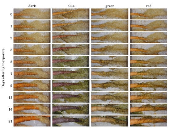 Time-course changes in the morphology of the carrot taproots after light exposure. Scale bars represent 2.5 cm.