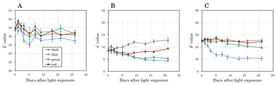 Time-course changes in the color parameters of the carrot taproots after light exposure. Time-course changes in the L* (A), a* (B), and b* (C) values of the taproot epidermis. Vertical bars represent ± SE (n = 8).