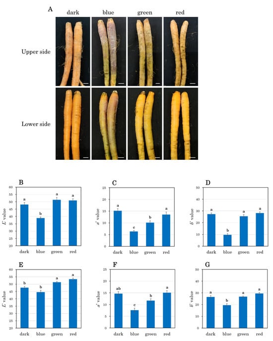 Visual comparison of the carrot taproots exposed to light for 21 days. (A) Taproots were observed from the upper and lower sides. Scale bars represent 1 cm. L* (B), a* (C), and b* (D) values of upper sides of taproots. L* (E), a* (F), and b* (G) values of lower sides of taproots. Vertical bars represent ± SE (n = 8). Different letters indicate significant differences between treatment groups (p < 0.05, Tukey–Kramer test).