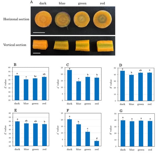 Visual comparison of the carrot taproot sections exposed to light for 21 days. (A) Taproot sections were observed from horizontal and vertical slices. Scale bars represent 1 cm. L* (B), a* (C), and b* (D) values of the taproot outer cortex. L* (E), a* (F), and b* (G) values of the taproot steles. Vertical bars represent ± SE (n = 8). Different letters indicate significant differences between treatment groups (p < 0.05, Tukey–Kramer test).