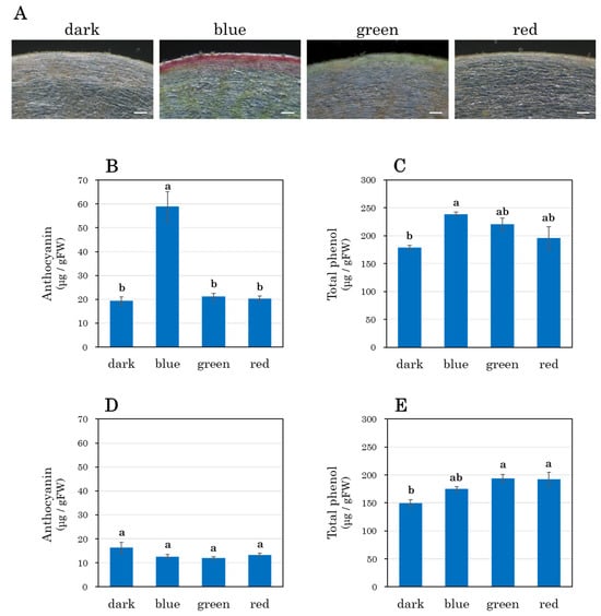 Microscopic observation of the taproot epidermis and outer cortex revealed strong reddish-purple pigmentation in the blue light treatment (Figure 6A). Quantification of anthocyanin content confirmed that anthocyanin accumulation was significantly higher in the blue light treatment than in other groups (Figure 6B). Given that anthocyanins are phenolic compounds synthesized in response to light [33], total phenol content was also analyzed. The results showed the highest accumulation in the blue light treatment, followed by the green and red light treatments (Figure 6C). In contrast, anthocyanin content in the stele did not differ significantly among treatment groups (Figure 6D). However, total phenol content in the stele was significantly higher in the green and red light treatments, while the blue light treatment showed an increasing trend compared to the dark control (Figure 6E).