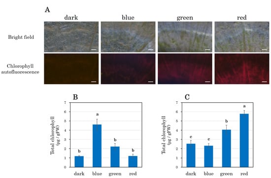 Since the green and red light treatments induced green pigmentation in the stele, microscopic observations were conducted. Green-colored areas in the stele were observed in both the red and green light treatments, with chlorophyll autofluorescence indicating chloroplast development (Figure 7A). Chlorophyll quantification showed that in the epidermis and outer cortex, chlorophyll content was significantly higher in the blue light treatment (Figure 7B). In contrast, in the stele, chlorophyll content was significantly increased in the red light treatment, followed by the green light treatment, compared to the dark control (Figure 7C).