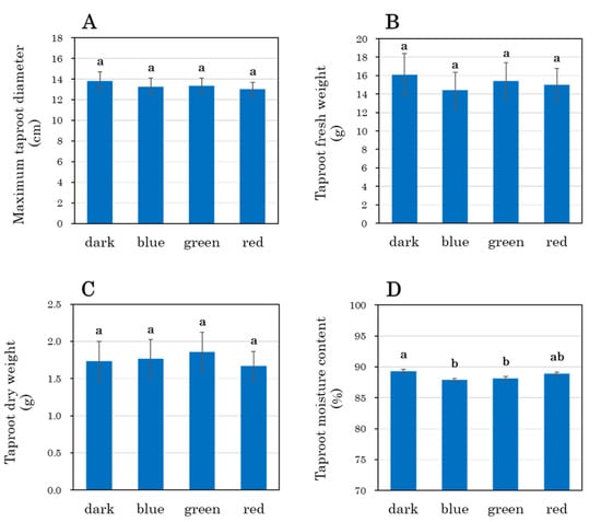 Maximum diameter (A), fresh weight (B), dry weight (C), and moisture content (D) of carrot taproots exposed to light for 21 days. Vertical bars represent ± SE (n = 8). Different letters indicate significant differences between treatment groups (p < 0.05, Tukey–Kramer test).