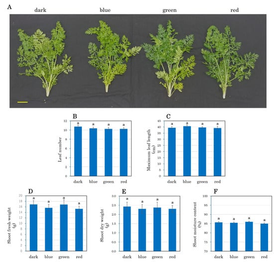 Pictures of shoots (A), leaf number (B), maximum leaf length (C), shoot fresh weight (D), shoot dry weight (E), and shoot moisture content (F) of carrot taproots exposed to light for 21 days. Scale bar represents 5 cm. Vertical bars represent ± SE (n = 8). Different letters indicate significant differences between treatment groups (p < 0.05, Tukey–Kramer test).