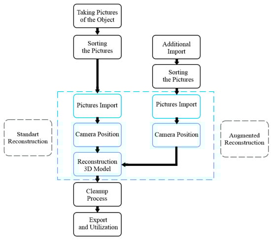 The process of 3D model reconstruction can be time-consuming, but with Agisoft Metashape software, the steps become more straightforward. There are various photogrammetry methods that require in-depth knowledge to achieve specific results. However, for simple 3D model creation, the basic features of the software are sufficient. The user only needs to provide images of the object, fix any issues that arise, and remove unwanted parts of the generated mesh using other software. Meanwhile, most of the technical processes will be handled automatically by the software. To facilitate understanding, the entire workflow was visualized in a flowchart. This diagram helps distinguish between tasks performed by the user and those handled automatically by the software. The flowchart is presented in Figure 1, where tasks in the blue area are performed by the software with minimal user intervention. This method applies to basic reconstruction, but more experienced users can adjust the workflow according to their needs.