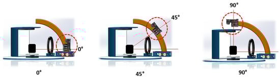 The design of the photogrammetry studio setup aims to capture high-quality images from several angles and create an accurate 3D reconstruction of the train brake pad. The system comprises a rotating arm with a mounted camera, enabling image capture at 0°, 45°, and 90°. These angles provide comprehensive coverage of the object’s geometry, ensuring the construction of detailed 3D model. The object is placed centrally on a stable platform, with a supporting structure holding additional components that contribute to maintaining balance and correlation, as shown in Figure 6.
