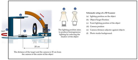 As shown in Figure 7, the schematic setup of a 3D scanner consists of a rotating platform (f) where the object (b) is placed for scanning, with a camera (d) positioned 30 cm away to capture images from different angles. The camera is mounted on an adjustable arm (e) to modify focus and distance as needed. Lighting positions (a and c) are strategically placed to ensure uniform illumination, reducing shadows for a clearer scan. As the studio rotates 360°, the camera captures multiple images, aided by a clean photo studio background (f) to enhance accuracy. The setup incorporates proper lighting and a neutral background for best image conditions. These elements help minimize unwanted reflections and reduce noise to improve the accuracy of the photogrammetry process. Additionally, tie points are strategically placed on the object as reference markers that facilitate accurate triangulation during images processing. Along a predefined trajectory, the camera is positioned to ensure appropriate correlation of images. This stage is essential to achieve precise spatial positioning and reduce errors in the 3D reconstruction process.