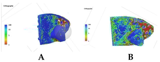 Figure 13 shows the color map which represents the reconstruction confidence level of each point, where blue indicates high confidence (≈100), green to yellow indicates moderate confidence (≈10–50), and red indicates low confidence (≈1). In contrast, Image B (AI-based photogrammetry Software) shows a more uniform confidence distribution, with fewer red and more green/blue areas, suggesting higher reconstruction accuracy and limited artifacts. AI-based photogrammetry uses deep learning models trained on extensive datasets, which allows for prediction of missing data, enhances feature detection, and improves surface consistency. Compared to traditional photogrammetry, which follows a linear depth estimation process, AI-based methods dynamically adjust and optimize depth calculations, serving as a robust strategy in handling occlusions, lighting variations, and low-texture surfaces. The confidence level map in Image B suggests a closer alignment between the reconstructed model and the real object, leading to a more stable and reliable 3D representation.