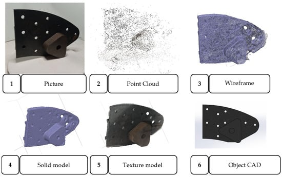 Reverse engineering (RE) is a fundamental process in contemporary engineering that facilitates the re-measurement and recreation of 3D models for existing manufactured parts []. This method has been widely applied across industries including aerospace, automotive, and railway engineering to repair damaged components, enhance the performance of used parts, and design new components based on older models [,,]. Through RE, engineers can refine designs by digitally reconstructing objects, enhancing efficiency, and prolonging the operational lifespan of crucial mechanical components [,,]. RE, as a practical implementation of inverse analysis, also intersects with structural diagnosis and simulation efforts. Inverse analysis serves as a mathematical framework to estimate material or boundary properties from observable responses—such as displacements or strains—based on experimental data. G. Maier’s contributions [,] in this domain integrate mechanical testing with inverse analysis, often enhanced by Digital Image Correlation (DIC), to enable accurate identification of damage locations and mechanical parameters. This approach reinforces the role of RE not only in geometric modeling but also in structural integrity assessment and predictive diagnostics [,]. As a widely used method in RE, photogrammetry enables 3D object reconstruction by capturing multiple images from varying angles []. It also extracts spatial data from 2D images, generating highly precise 3D models. The widespread application is largely attributed to cost-effectiveness, user-friendliness, and the capability to capture intricate details without direct contact with the object [,,].