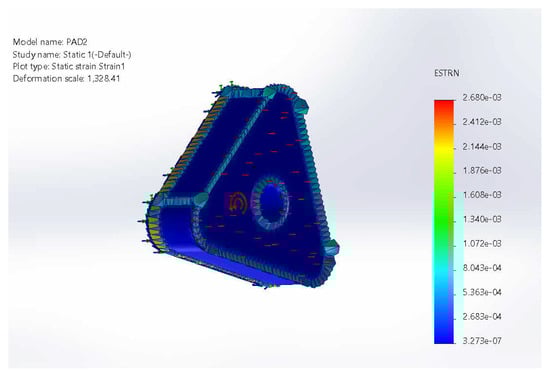 As presented in Figure 16, the strain distribution across the brake pad shows significant variations, with the highest values concentrated in specific areas, prominently denoted in red. According to the color scale, the maximum strain observed is approximately 2.68 × 10−3, indicating the areas experiencing the most significant deformation. In comparison, the strain remains relatively low across the majority of the structure, suggesting that the material is experiencing minimal elongation or deformation under the applied static load. This distribution implies that, while most of brake pads retain their structural integrity under the given conditions, localized regions of higher strain, particularly in areas with geometric complexity such as corners, edges, or transitions in thickness, are subjected to greater deformation. These areas likely correspond to stress concentrators, where abrupt changes in geometry cause localized amplification of mechanical stress and strain. The results suggest that, while the overall design maintains stability under load, the identified high-strain areas may require closer examination to prevent potential issues related to material fatigue, wear, or failure over time.