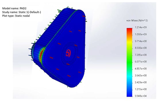 Figure 18 provides crucial insights into stress distribution across the brake pad, showing that the areas might be susceptible to material failure. The analysis identifies areas with the highest stress concentrations, which are particularly important for evaluating potential risks of yielding or structural damage. The maximum recorded von Mises stress is 1.214 × 109 N/m2 (1.214 GPa), occurring in localized areas that experience the greatest loading conditions. This value significantly exceeds the material’s yield strength of 250 MPa (2.5 × 108 N/m2), showing that certain areas of the brake pad are subjected to stress levels beyond the elastic limit of the material. Consequently, the areas are prone to plastic deformation, which can compromise brake pad’s integrity and lead to long-term performance issues or even failure under repeated loading cycles. The stress distribution suggests that the most critical areas are found in geometric discontinuities, such as sharp edges, corners, or abrupt thickness transitions. Additionally, von Mises stress exceeding the yield limit implies that the material is overstressed, potentially requiring design modifications to mitigate excessive stress concentrations. Possible solutions may include optimizing the geometry to distribute stress more evenly, selecting a material with higher yield strength, or incorporating reinforcements in high-stress regions. Figure 18 presents the results of a von Mises stress analysis, which visualizes the equivalent stress (σeq or σvon Mises) distributed throughout the brake pad under static loading conditions. This scalar stress measure, derived from the full stress tensor, represents an equivalent uniaxial stress used to predict yielding of ductile materials. The von Mises criterion is commonly applied in engineering simulations to evaluate whether the material at any location has exceeded its yield strength. In this analysis, stress values range from approximately 9.94 × 104 N/m2 (blue, low stress) to 1.214 × 109 N/m2 (red, high stress), with the yield strength indicated by a red threshold line at 2.5 × 108 N/m2. Regions with stress above this threshold are at risk of plastic deformation or failure, making von Mises stress a critical parameter in safety and durability assessments.