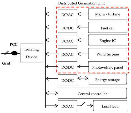 Microgrids can be connected to the grid through a point of common coupling (PCC). The isolation device isolates the microgrid from the electrical energy grid. Distributed Generation (DG) units, both renewable and conventional, are responsible for generating electrical energy in the system. The energy storage system balances and controls the flow of energy. The control system, which may consist of a central controller or distributed controller, is responsible for maintaining the microgrid safely in different operating modes [10].