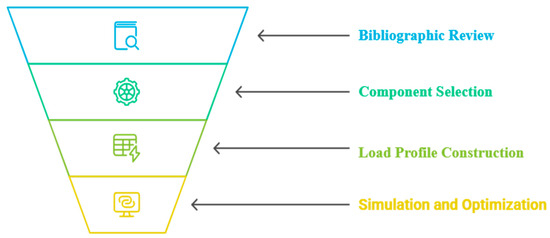 This section presents the methodology adopted for the sizing of an isolated microgrid located in the Brazilian Amazon, using solar photovoltaic energy as the primary generation source. The overall procedure applied in this study is summarized in Figure 3, which outlines the steps involved in system modeling, data collection, simulation, and performance evaluation.