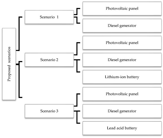 The sizing of the system will be carried out considering three scenarios. Scenario 1 will consist of photovoltaic panels and a DG, assuming that the storage system cannot be replaced and must be removed from the installation. For the two following scenarios, sodium batteries will be replaced with lithium-ion and lead–acid batteries, respectively. Therefore, the proposed Scenario 2 will consist of photovoltaic panels, a lithium-ion battery bank as a storage system, and a DG as a backup system. Finally, Scenario 3 consists of photovoltaic panels, a lead–acid battery bank as a storage system, and a DG as a backup system. The diagram in Figure 5 shows the components of the system for the proposed scenarios.