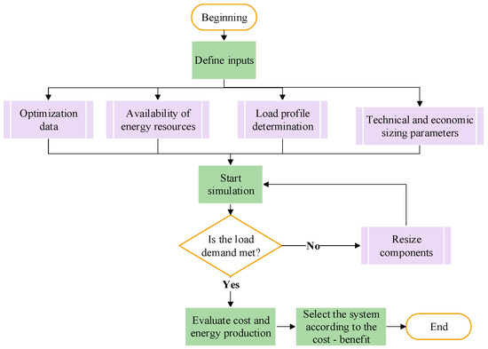 - Evaluation of costs and energy production: Once all the input variables are defined, the simulation and optimization of the system are initiated. If the load demand is not met, components must be resized; otherwise, the costs and energy production of the proposed scenarios need to be evaluated. The costs to be analyzed include the total net present cost (NPC), the levelized cost of energy (LCOE), and the initial investment cost. Other system variables that will also be analyzed include the renewable fraction, diesel consumption, and excess electricity.