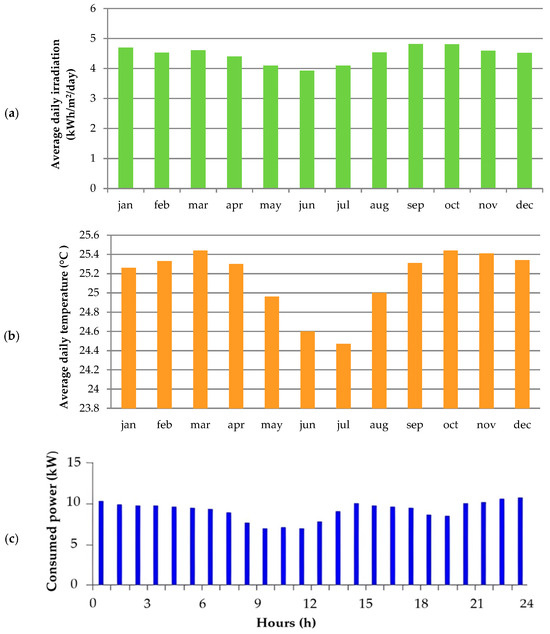 (a) Generation potential by average monthly irradiation, (b) average monthly temperature, and (c) daily energy consumption.