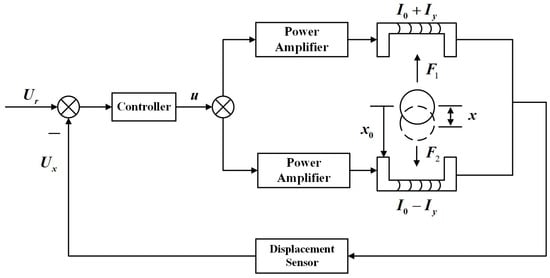 A magnetic bearing system contains two radial magnetic bearings and one axial magnetic bearing, with four radial degrees of freedom and two axial degrees of freedom. Since both the axial and radial magnetic bearings use differential control, this paper takes one degree of freedom in the radial magnetic bearing as an example (as shown in Figure 1) for control system design. When the rotor is disturbed and then shifts downward by x, to make the rotor re-positioned at the equilibrium position x0, firstly, the displacement sensor detects the rotor position voltage signal Ux, and then the controller obtains the control voltage u according to the difference between the desired voltage Ur and the voltage signal Ux based on the control algorithm. Finally, the power amplifier generates the stator currents of the upper and lower magnetic pole, which are the sum of I0 + Iy and the difference in I0 − Iy of the bias current and the control current, to change the electromagnetic forces F1 and F2 of the upper and lower magnetic poles. As a result, the rotor is re-suspended at the equilibrium position.