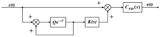 The core principle of the repetitive controller is internal mode, which can generate infinite gain at harmonic frequencies to track the disturbance signal and then eliminate periodic disturbances [24]. However, the commonly used ideal repetitive controller has disadvantages of delay control and insufficient rejection of linear disturbances. In order to ensure the robustness of the system, we designed a plug-in repetitive controller (PRC) (as shown in Figure 2), where Q is the gain of the delay link, which is generally taken to be a constant of slightly less than 1, e−sT is the delay link, T is the time for the rotor to rotate one revolution, K(s) is the compensator, and CPID(s) is a PID controller.