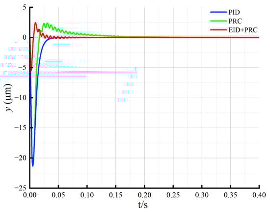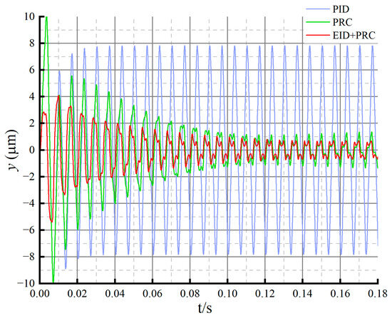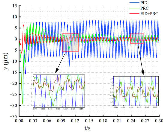 Adding the periodic disturbance, the rotor position changes as shown in Figure 7. The PID controller has low steady-state accuracy and a large error. The plug-in repetitive controller has significantly improved the ability to reject periodic disturbances but still has a large overshoot. The designed method in this paper provides effective rejection of periodic disturbances, improves the steady-state control accuracy, and reduces the overshoot.