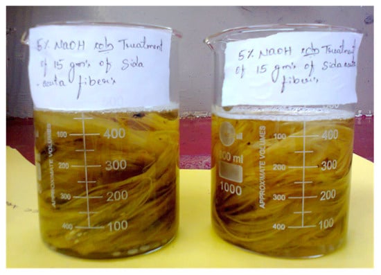 Prior to surface treatment, Sida acuta fibers were dried in an air oven at 50 °C for 20 h to remove moisture and facilitate better alkali penetration during chemical modification. Subsequently, the dried fibers were treated with a 5% NaOH solution (refer to Figure 1). Approximately 30 g of Sida acuta fibers was treated with a 5% NaOH solution at room temperature for a duration of 4 h. After alkali treatment, the Sida acuta fibers were rinsed 2–3 times with warm water to remove residual NaOH, followed by immersion in a 0.1 N acetic acid solution for 3 min to neutralize the surface. Subsequently, the fibers soaked in acetic acid were rinsed with warm water to remove any residual solution from the surface and then dried at room temperature for 48 h. The procedure for fiber surface treatment and the optimal test conditions were selected based on the fiber strength, referring to past literature [19], consultation with experts, and pilot experimental studies at research laboratories.
