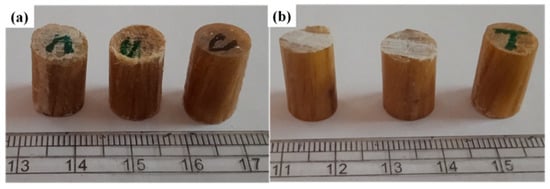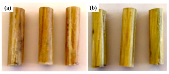 Compression test samples. (a) Untreated fiber-reinforced composites and (b) treated fiber-reinforced composites.