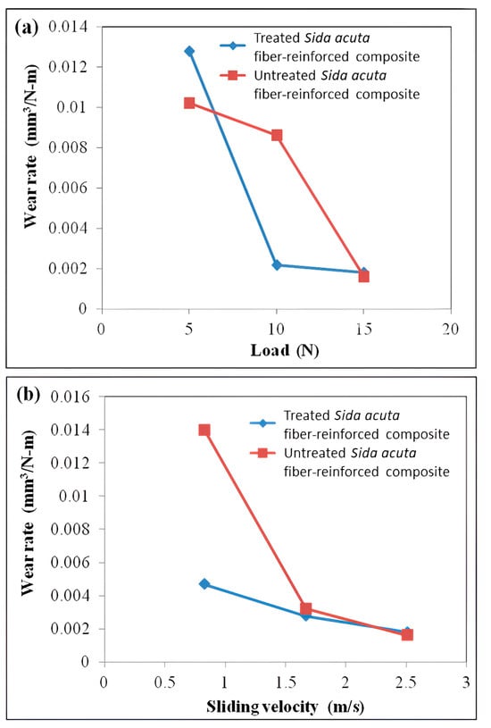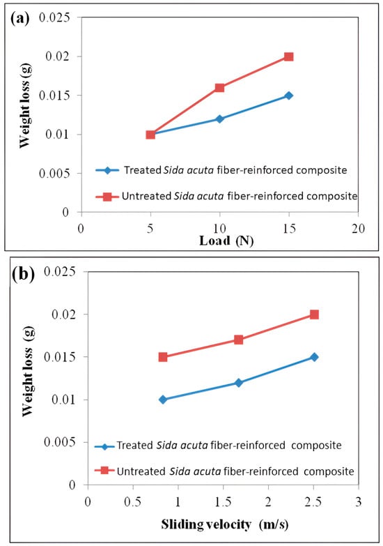 (a) Wear of Sida acuta fiber-reinforced composites after wear testing at a sliding velocity of 2.51 m/s under various normal loads; (b) wear of Sida acuta fiber-reinforced composites after wear testing at a constant load of 15 N under various sliding velocities.
