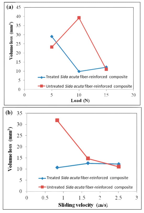 Figure 7a depicts the volume loss of NaOH-treated and untreated fiber-reinforced composites under various applied loads at a constant sliding velocity of 2.51 m/s. The volume loss of the alkali-treated fiber-reinforced composite decreased by 66.21%, with an increase in the applied load from 5 N to 10 N. With a further increase in the applied load from 10 N to 15 N, the volume loss of the composite laminate increased by 19.59% compared to the 10 N condition, yet remained 57.98% lower than that observed at 5 N. As shown in Figure 7a, the volume loss of the untreated fiber-reinforced composite at a 15 N load and a sliding velocity of 2.51 m/s decreased by 52.56% and 72% compared to the values observed at 5 N and 10 N loads, respectively. Both alkali-treated and untreated Sida acuta fiber-reinforced composites exhibited a minimum volume loss of approximately 11.5 mm3 at a 15 N load and a sliding velocity of 2.51 m/s, indicating lower wear under these conditions. The decrease in volume loss at higher loads is mainly due to the formation of a protective transfer layer, surface smoothing, and compaction of wear debris, all of which act to shield the composite from further wear [47]. The untreated fibers have poor adhesion with the epoxy matrix, which might be due to the presence of surface impurities, leading to higher wear through fiber–matrix separation and surface degradation under stress [44,45]. It is important to note that both composites perform similarly at higher loads (probably due to matrix densification and friction-induced stability). However, the treated composite consistently shows superior wear resistance at lower and moderate loads due to better fiber–matrix integrity.