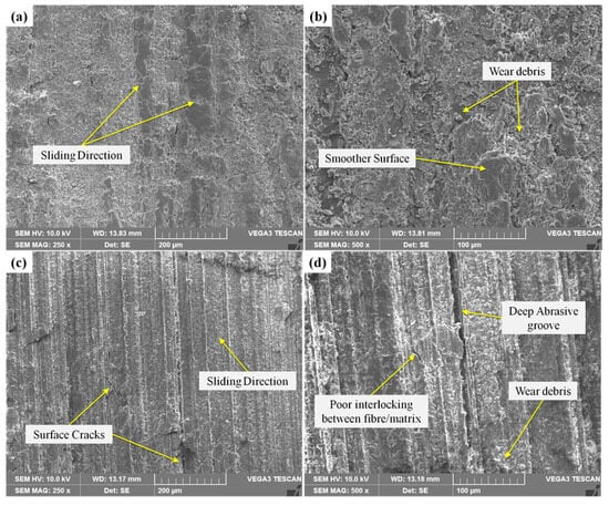 SEM analysis was performed on the worn surfaces of 5% alkali-treated and untreated Sida acuta epoxy composite specimens tested at a sliding velocity of 2.51 m/s and a load of 15 N. Figure 9a,b and Figure 9c,d display the respective surface morphologies at 250× and 500× magnifications. Figure 9a,b reveal that the worn surface of the alkali-treated Sida acuta fiber-reinforced composite is relatively smooth, with identifiable features such as the sliding direction, wear debris, surface cracks, and pits. Figure 9c,d illustrates the worn surface of the untreated fiber epoxy composite, characterized by pronounced abrasive grooves in the sliding direction, weak fiber–matrix interfacial bonding, surface cracking, and visible wear debris. The presence of deep grooves on the worn surface of the untreated fiber laminate indicates the dominance of an abrasive wear mechanism. Therefore, the formation of deep grooves and weak interfacial bonding between the fiber and matrix in the untreated Sida acuta composite contributes to a higher wear rate compared to the treated fiber-reinforced composite under maximum sliding velocity and applied load conditions.