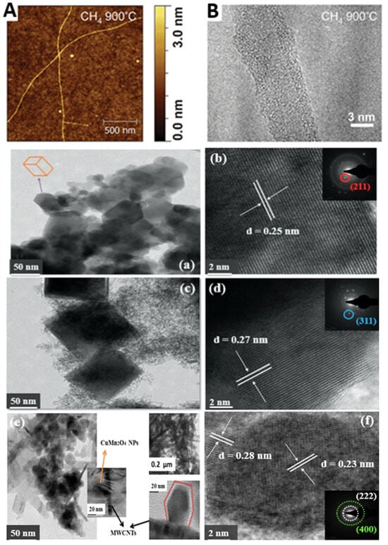(A) Typical AFM scan of CH4 grown nanotubes (900 °C with 0.2 nm thick Ta-oxide on SiO2). (B) TEM image of a CH4 grown SWNT (900 °C with 0.2 nm Ta-oxide grown on SiO2 TEM membrane). (a) HR-TEM images of Mn3O4 viewed at 50 nm scale and (b) 2 nm scale. (c) HR-TEM images of CuMn2O4 at the 50 nm scale and (d) 2 nm scale. (e) HR-TEM images of CuMn2O4/MWCNTs at the 50 nm scale and (f) 2 nm scale [,].