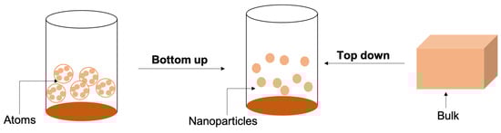 Those techniques of nanomaterials production consist of reducing the size of bulk material until reaching the nanoscale []. Although the top-down approach is relatively easy to manipulate, the application of top-down technologies for large-scale production [] might result in significant environmental impact associated with waste generation [,] in addition to the lack of control over the shape and structure of the particles [].