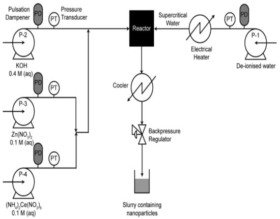 On the other hand, the use of hydrothermal synthesis has proven to be useful in the synthesis of customized nanomaterials with precise control over the particle size, morphology, and composition [,,] Some hydrothermal techniques have successfully transitioned to industrial scale through the use of continuous hydrothermal processes, which employ continuous-flow reactors instead of traditional batch autoclaves. An example of the successful large-scale manufacturing of nanomaterials is the SHYMAN project, which uses hydrothermal continuous synthesis to produce nanomaterials by mixing superheated or supercritical water with an aqueous flow containing a dissolved metal salt. Figure 3 shows a scheme of the system flow used in the SHYMAN plant. This method shows high scalability from laboratory scale (g/h) to industrial scale (Tonnes/year) with costs below 10 euros/kg for some nanomaterials [], in addition to the production of various nanomaterials such as metal perovskite Ba1−xSrxTiO3 [], MoS2 [], TiO2 [], Bi2CuO4 [] Cu2−xTe, VO2 and ZrO2, [,,].