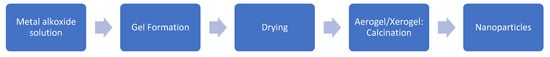 Sol-gel is considered to be one of the simplest and most commonly used methods for the synthesis of nanoparticles. It is composed of a few straightforward steps, as shown in Figure 4. The sol-gel technique is used to prepare 35% of nanomaterials worldwide, which makes it one of the most used techniques to prepare nanomaterials. It is a chemical method that comprises a solution working as a precursor for an assimilated system of distinct particles [], which offers the potential control of the whole reaction during synthesis []. It was first used to prepare monolithic glass, ceramics, and aerogel materials at an industrial scale at a relatively low temperature. It is just in the last few years that it has been developed for the production of advanced nanomaterials and coatings [,,]. The sol is a colloidal solution made of suspended solids in a liquid phase, and the gel can be considered a solid macromolecule dispersed in a solvent. This technique consists of the transformation of the sol into a gel state with a post-treatment and transition into solid oxide material.