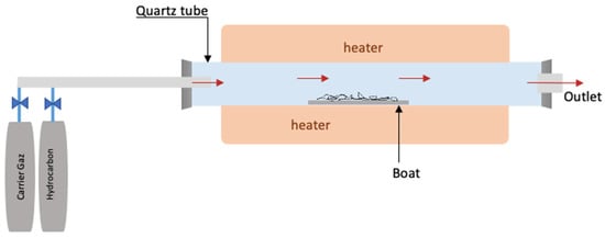 The CVD method is a vacuum method based on the reaction between the substrate and gaseous phase precursors to obtain high-quality-performance solid materials, as indicated in Figure 5 below. It was used mainly at an industrial scale to produce thin film materials for semiconductor industries before being extended to the production of nanomaterials. The activation of the CVD reaction can be due to a temperature increase (thermal CVD) or enhanced by plasma assist (plasma-enhanced CVD) [,].