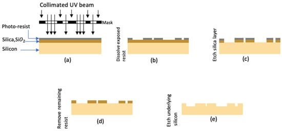 Simple scheme of photolithography []: In step (a), an oxidized silicon wafer is coated with a 1 µm thick photoresist layer. A beam of UV light is directed through a patterned mask and focused by lenses to reduce the image size, initiating a photochemical reaction in the exposed resist areas. In step (b), the wafer undergoes development, during which the exposed photoresist is dissolved, revealing a replica of the mask pattern. Step (c) involves immersing the wafer in an acidic solution that selectively etches away the exposed silica layer, leaving the resist and silicon intact. In step (d), the remaining photoresist is removed using a different acidic solution, exposing the underlying silicon. Finally, in step (e), further etching removes silicon from the exposed regions, forming nanoscale channels that define the chip’s structure.