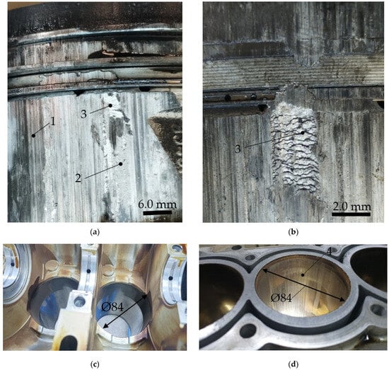 Operational damage to the elements of the cylinder-piston group of the Kia Sportage car manufactured in 2022: general view of the in-service damaged piston (a); image of the nature of damage-adhesions between the surfaces of the liner and the piston (b); general view of the damaged cylinder block of the engine (c); scuffing of the cylinder liner surface (d); 1, 4—scratches, zone; 2—friction zone; 3—bonding zone; 4—scuffs.
