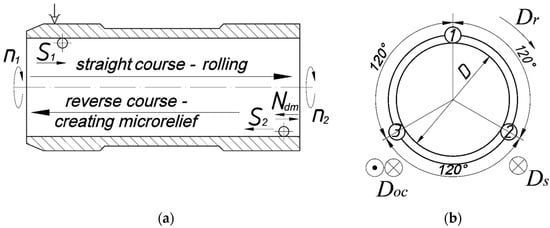 The basics of the technology for forming microreliefs on internal cylindrical surfaces were developed a relatively long time ago [16,17] and were gradually improved by taking into account the mechanisms of plastic deformation of the surface layers of metal by deformable elements [18,19,20].