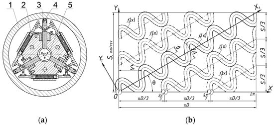 Depending on the specified geometric microrelief parameters (A, b, Sk) and conditions, under which microrelief is formed (S, Nosc, nw), Formula (6) can be used to obtain the center line coordinates of the continuous regular microrelief’s grooves. Figure 4a shows how the scheme in Figure 3 is implemented in practice. The results obtained help create the specified types of regular microrelief on the outer cylindrical surfaces, as shown in Figure 4b.