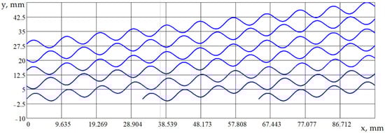 Analytical model (6) was programmed in MathCAD, and the centerlines of continuous regular microirregularities were obtained. They have the following parameters: A = 2.5 mm; S = 20 mm/rev; and Nosc = 10; D = 30 mm. These lines are sinusoidal. They allowed us to make a scan of the cylinder liner’s surface using the method of rotating the coordinate axes (see Figure 5).