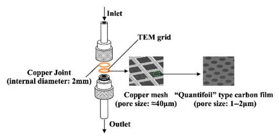 - Ogura, I.; Hashimoto, N.; Kotake, M.; Sakurai, H.; Kishimoto, A.; Honda, K. Aerosol particle collection efficiency of holey carbon film-coated TEM grids. Aerosol Sci. Technol. 2014, 48, 758–767. [Google Scholar] [CrossRef]