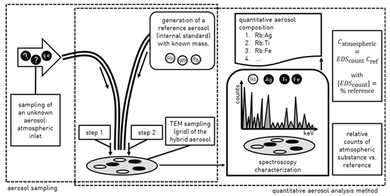The “unknown specimen” that needs to be characterized was deposited on a TEM grid (Step 1). After loading with a specific number and mass of reference nanoparticles (Step 2) on the same grid, the mass percentages of the deposited elements were compared by EDS mapping. The mass of element involved in the unknown aerosol can be calculated by the mass percentage and the mass of reference element, as described in Figure 2. The set-up for depositing particles and the microscopical analysis are described below.