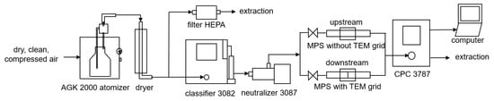 The experimental design of the set-up for salt particle deposition is shown in Figure 3. A membrane dryer generated clean, dry, and compressed air. Polydisperse aerosol was generated by spray drying salt solution (CsCl, RbCl, SrCl2, Ga(NO3)3 or NaCl) using an atomizer (PALAS AGK 2000, Palas, Karlsruhe, Germany). A 5–20 mmol/L salt solution concentrations were set for comparison. An applied pressure of 0.8 bar was selected for the atomizer. Two silica gel dryers removed water drops, and the humidity was hence below 5%. The extra airflow was emitted through a HEPA filter. Monodisperse nano aerosols were produced by an electrostatic classifier (3082, TSI), which includes a neutralizer (3088) and a nano Differential Mobility Analyzer (DMA 3085 A, TSI, Marseille, France). The aerosolized particles were neutralized by a radioactive source (TSI 3087) upstream of the filter. The neutralizer was utilized first to establish an equilibrium charge state on the particles, with known percentages of particles carrying no charge, single charge, and multiple charges associated with positive and negative polarities entering the DMA [31,32]. Valves were utilized for inducing the flow to two symmetrically placed MPS, one with a TEM grid installed, as shown in Figure 3. The particle number was measured by a Condensation Particle Counter (CPC 3787, TSI, Marseille, France). A flowrate of 0.6 L/min was set for the CPC pumping. The particle number deposited on the TEM grid () was calculated based on the particle numbers upstream () and downstream (), which counted by CPC in the conditions of without the TEM grid, and with the TEM grid, respectively.