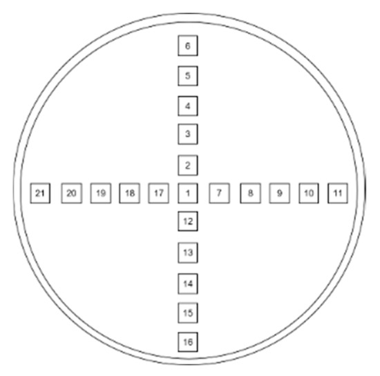 A TEM grid with 21 squares with uniform spaces. The positions are numbered from 1 to 21.