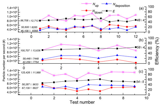 Samplings of (a) 12 repetitions for depositing 60 nm RbCl particles generated from 10 mmol/L RbCl solution; (b) 6 repetitions for depositing 60 nm CsCl particles generated from 10 mmol/L CsCl solution; and (c) 9 repetitions for depositing 60 nm CsCl particles generated from 20 mmol/L CsCl solution were carried out in different days. The sampling upstream and downstream lasted for 1–30 min. Then, 1.2/1.3-type TEM grids were used. The average particle number upstream and downstream per second, the average deposited particle number per second, and the collection efficiency in three sampling conditions are shown in Figure 5. The mean value and standard deviations (SD) are indicated.