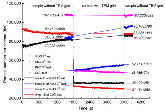 Figure 6 shows the changes in particle numbers detected by CPC with time for four tests. The particle number was recorded every second. Then, 60 nm RbCl or CsCl nanoparticles generated from 10 mmol/L RbCl or CsCl solutions were collected on the 1.2/1.3-TEM grids. A 5–30 min sampling period without TEM grid (Stage 1) was carried out firstly for each test. After collecting particles with TEM grids for 30 min (Stage 2), the particle number upstream was measured again for 5 min (Stage 3). The mean and standard deviation of each data set for sampling with TEM grid and without TEM grid have been added. Particle number for sampling with TEM grid and without TEM grid have been fitted, respectively. The results of linear regression and the product-moment correlation coefficients (r) are shown in Table 2.