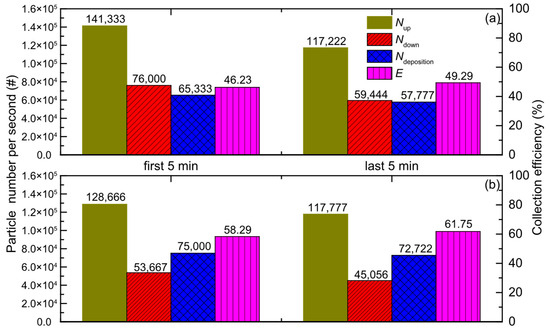 Stabilities of particle number upstream (Nup), particle number downstream (Ndown), deposited particle number (Ndeposition), and collection efficiency (E) during (a) 2 h; and (b) 9 h deposition.