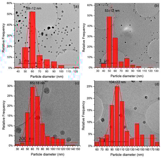 Besides the particle number, particle size and shape were taken into account for the mass calculation of the reference elements. Figure 8 shows the representative TEM images of different depositions. The different conditions have been explained in Table 3. The size distributions of deposited particles were obtained by counting at least 500 particles from different sample regions using ImageJ. The mean and standard deviation of the particle diameter have been marked.