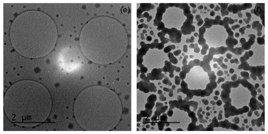 Particles observed here are homogeneously distributed on the porous TEM grid. For 9 h deposition shown in Figure 8f, particles are agglomerated, especially on the pores’ edges, showing that the pore wall deposition due to interception plays a significant role in the particle collection [35,36]. Moreover, the edges of SrCl2 particles are blurred when analyzing the samples after several days due to their hygroscopicity, as shown in Figure 8e. They are, therefore, not acceptable references.