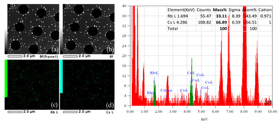 Using two salts, for example, 60 nm RbCl and CsCl, particles were deposited on a 1.2/1.3 TEM grid for 5 min. Both salt concentrations were 10 mmol/L. Figure 9a,b are STEM images of Square 8 before and after 15 min mapping. Comparing these two images, particles have not been destroyed after mapping. Particles showing a high dispersion in shape and size are observed on the carbon films but also at the hole edges. Figure 9c,d show Rb and Cs mapping images. Both elements Rb and Cs are homogeneously distributed on the carbon film. Between 1 and 10 keV, two peaks of elemental Rb located at 1–2 keV and several peaks for the Cs element in the 2–6 keV range have been observed, as shown in Figure 9e. Rb is a useful reference since it has fewer spectra peaks. From quantitative data, the mass ratio of elements Rb and Cs is around 33:67.